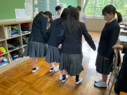 三人四脚の練習をしています。