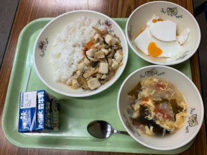 四川豆腐、トマトと卵のスープ、ごはん、みかんのミルク寒天、牛乳 です。
