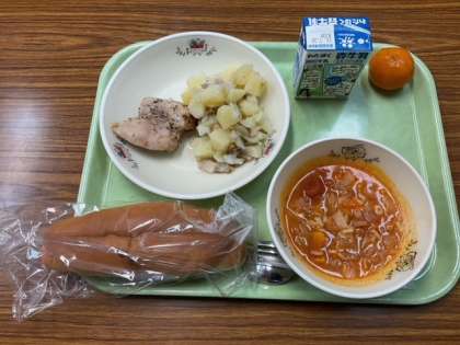 八王子産はちみつマスタードチキン、ジャーマンポテト、ミネストローネ、コッペパン、冷凍みかん、牛乳 です。