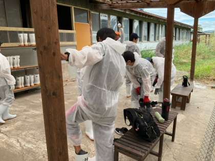 除菌をしっかりして牛舎へ向かいました。