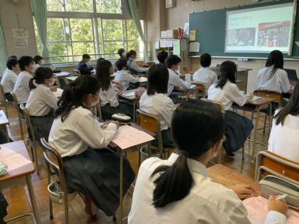 1年生から3年生が、一緒の教室で発表を聞いています。