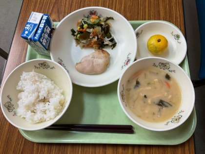 鶏のレモンしょうゆ、わかめサラダ、呉汁、ごはん、みかん、牛乳 です。