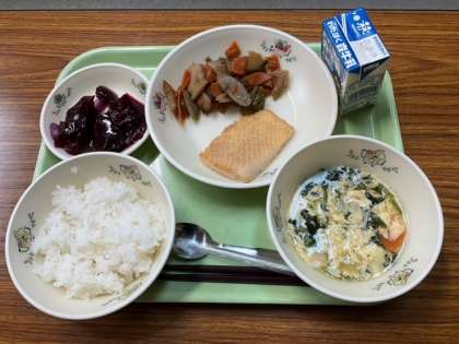 いかの香味焼き、人参きんぴら、かきたま汁、ごはん、山ぶどうゼリー、牛乳 です。