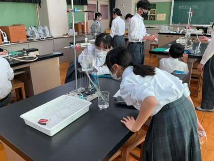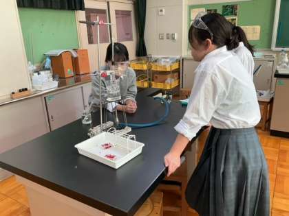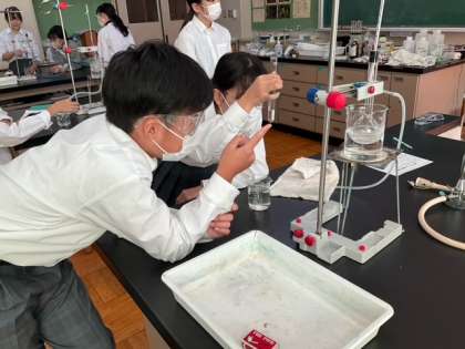 試験管の液体を覗いています。