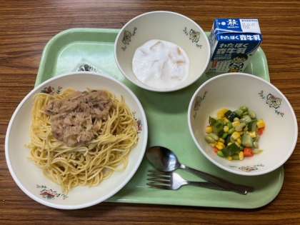 はち大根おろしスパゲティ、コロコロサラダ、ピーチヨーグルト、牛乳 です。
