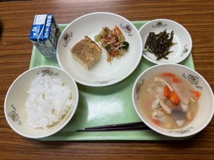松風焼き、野菜の彩り和え、芋の子汁、茎わかめのしょうが炒め、八王子産の白いごはん、牛乳 です。