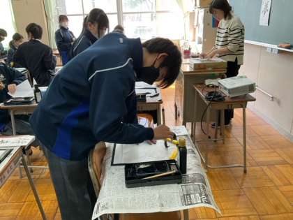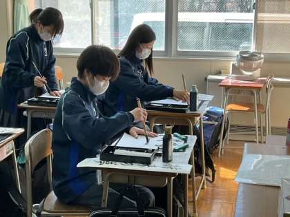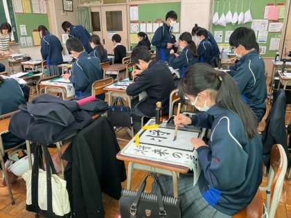 書き初め用の用紙で練習している生徒もいます。