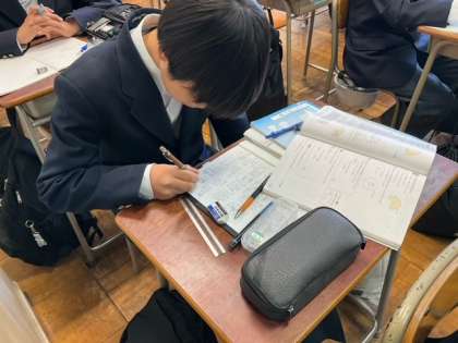 おうぎ形の中心角、弧の長さや面積の関係を利用して解く問題に取り組んでいます。