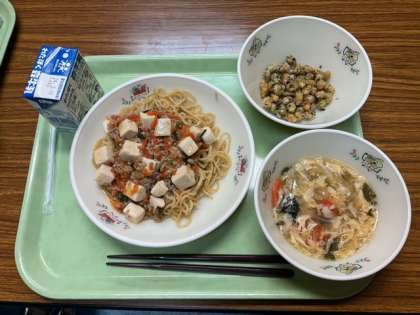 マーボー豆腐めん、ポップビーズ、たまごスープ、牛乳 です。