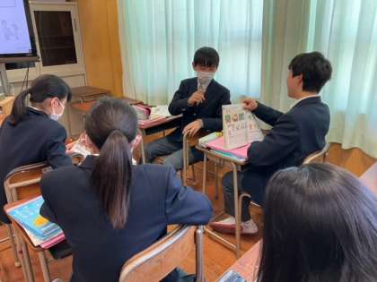 挿し絵を見て、英文を予想しています。