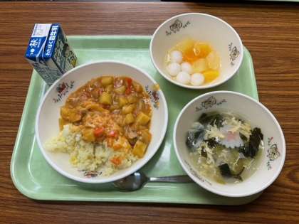 バターチキンカレー、フワちゃんのフワッとたまごスープ、フルーツ白玉、牛乳 です。