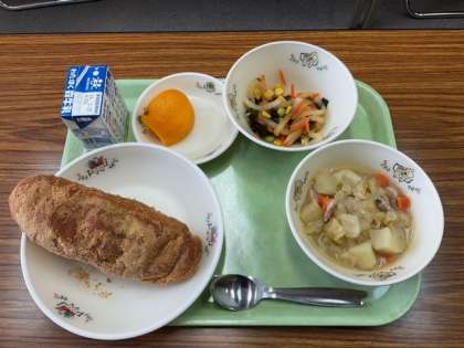 ポトフ、大根わかめサラダ、きなこ揚げパン、でこぽん、牛乳 です。