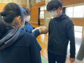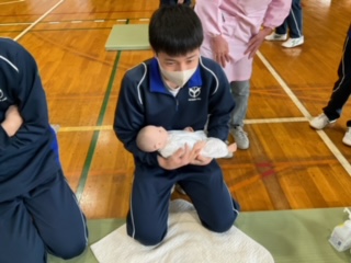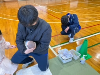 乳児の人形でふれ合い体験をしています。
