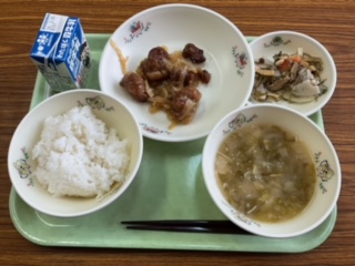 とんてき、ちゃつ、ごはん、あおさのみそ汁、牛乳 です。