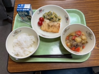 いかのネギ塩焼き、じゃこキャベツ、肉じゃが、八王子産ミニトマト、ごはん、牛乳 です。