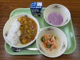 ポークカレーライス、大根のフレンチサラダ、里山フルーツヨーグルト、牛乳 です。