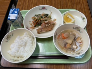 赤魚の利休焼き、野菜のじゃこ和え、田舎汁、ごはん、果物、牛乳 です。