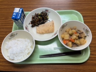 いかのねぎみそ焼き、ひじきの炒め煮、肉じゃが、ごはん、牛乳 です。