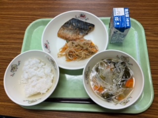 鯖の辛味焼き、切り干し大根の煮物、小豆島そうめんのすまし汁、ごはん、牛乳 です。