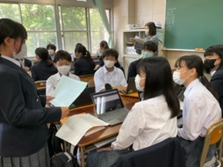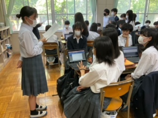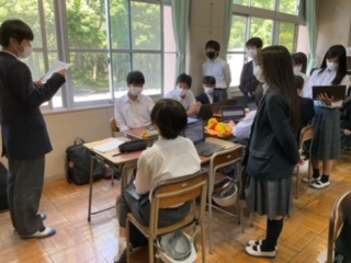 新聞の投書文の発表をしています。