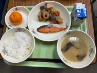 鮭の塩焼き、筑前煮、なめこのみそ汁、ごはん、果物、牛乳 です。