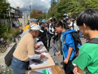 オリエンテーリングの説明を聞いて、地図を受け取っています。