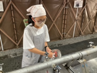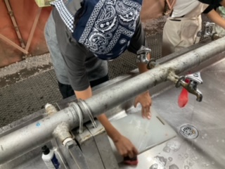 使い終わった調理器具を洗ってます。