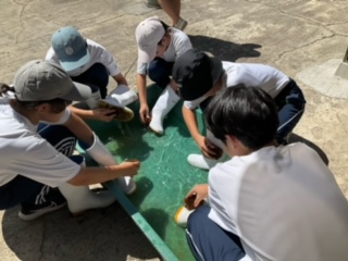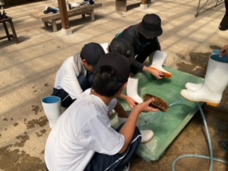 体験が終わり、使用した長靴を洗っています。