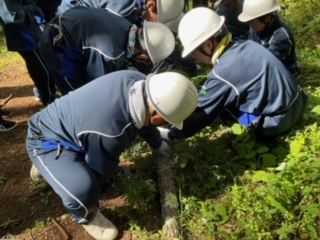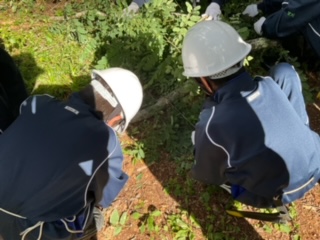 各自のノコギリで木を切っています。