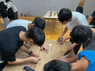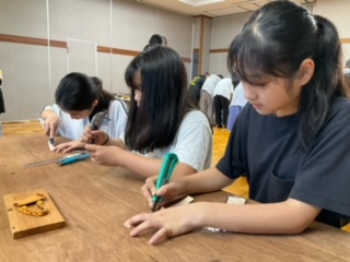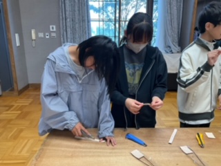 紐状の皮にカッターで切れ目を入れて編んでいきます。