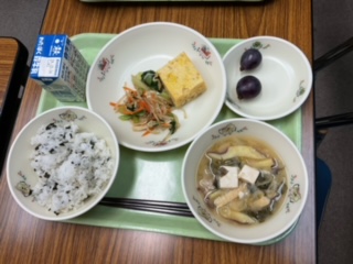 厚焼き卵、チンゲン菜のからし和え、さつまいものみそ汁、わかめごはん、巨峰、牛乳 です。