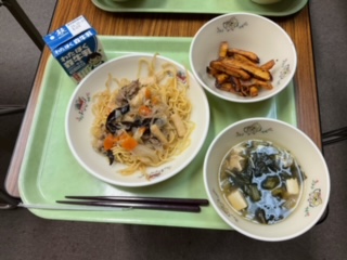 海鮮あんかけやきそば、大学芋、青菜と豆腐のスープ、牛乳 です。