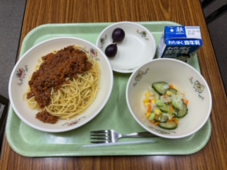 スパゲティミートソース、えだまめのサラダ、巨峰、牛乳 です。