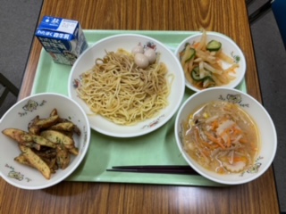 みそラーメン風つけめん、うずらの煮卵、のり塩ポテト、野菜の南蛮漬け、牛乳 です。