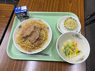 はち大根おろしスパゲティ、コールスロー、スイートポテト。牛乳 です。