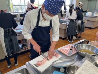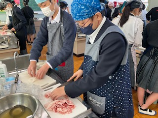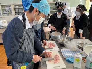 豚汁に入れるお肉を切っています。