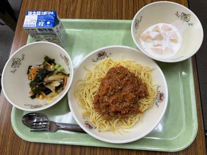 スパゲティミートソース、わかめサラダ、ピーチヨーグルト、牛乳 です。
