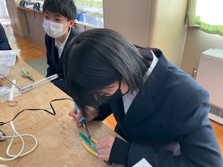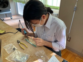 はんだ付けをしている生徒も、もう少しで組み立てに入れそうです。
