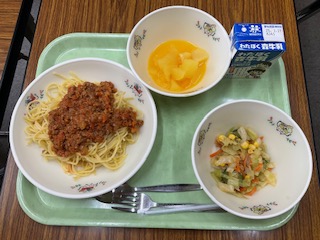 スパゲティミートソース、オニオンドレッシングサラダ、オレンジポンチ、牛乳 です。