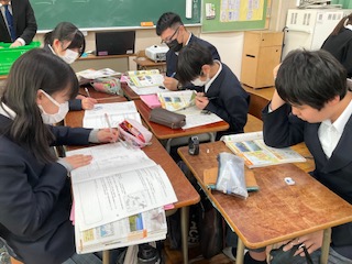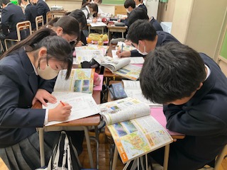 班で協力して、地形や県庁所在地などを確認しています。
