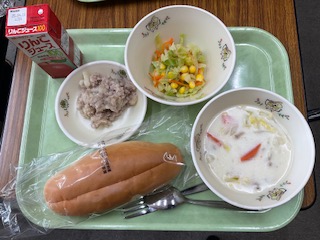 白菜のクリームシチュー、フレンチサラダ、コッペパンポテトミート、リンゴジュース です。