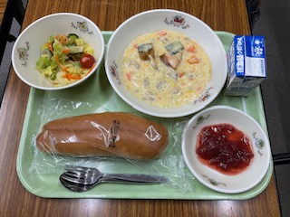 パンプキンシチュー、イタリアンサラダ、ミニトマト、国産小麦パン、手作りいちごジャム、牛乳 です。
