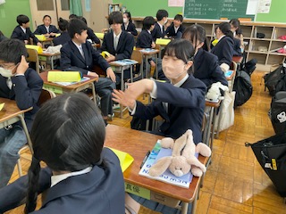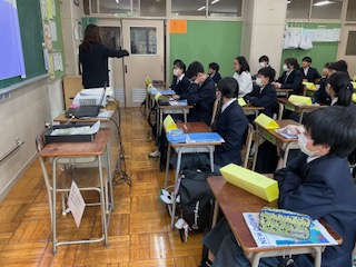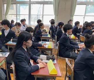 教科担当の先生の自己紹介を聞いています。