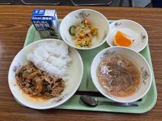 豚キムチ、ツナとキャベツのサラダ、くずきりスープ、ごはん、でこぽん、牛乳 です。