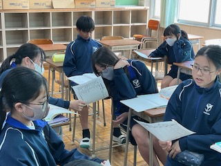 新出単語の発音練習をペアでしています。