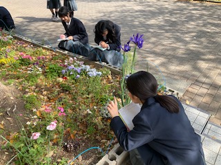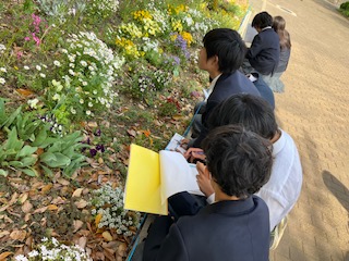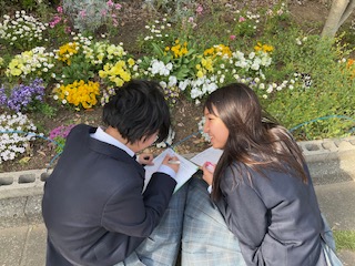 ルーペを持って屋外で観察中です。