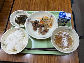 鰹の香り揚げ、もやしからし和え、茎わかめのしょうが炒め、沢煮椀、ごはん牛乳 です。