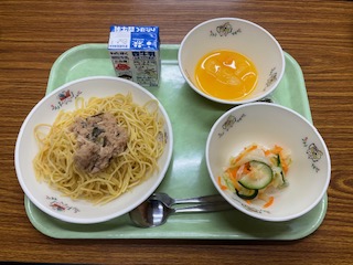 はち大根おろしスパゲティ、ズッキーニのサラダ、オレンジポンチ、牛乳 です。