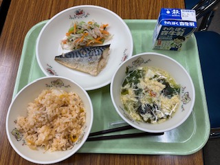 鯖の香味焼き、3色ナムル、チンゲン菜の卵スープ、はち大根のキムタクごはん、牛乳 です。