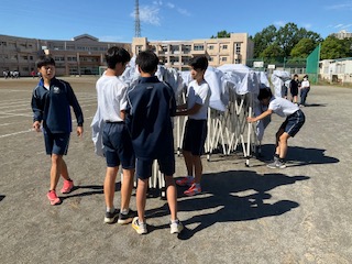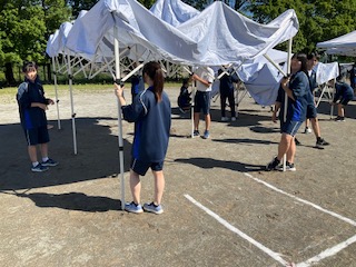 生徒席のテントを張っています。